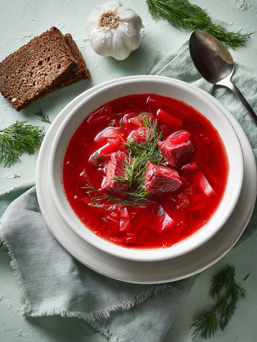 Состав: Говядина, капуста б/к, картофель, лук репчат., морковь, свекла, паста томат., сахар, зелень, чеснок, соль, специи, масло растит.