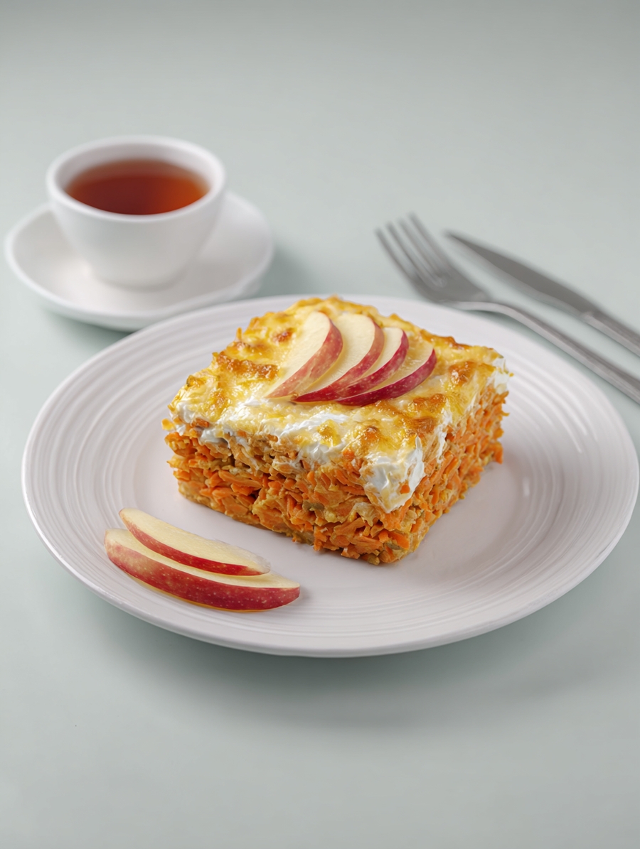 Состав: Морковь, творог 9% жирности, яблоки, стевия, эритрит, сукралоза, яйцо, соль, манная крупа, ванилин.
