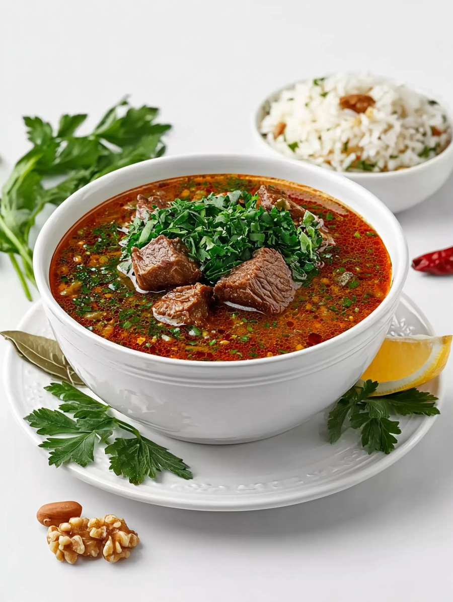 Состав: Вода питьевая, лук репчатый свежий, говядина лопатка,рис круглозерный, масло растительное, паста томатная пассерованная, чеснок свежий, специи, соль, кинза, бульон говяжий п/ф, аджика
