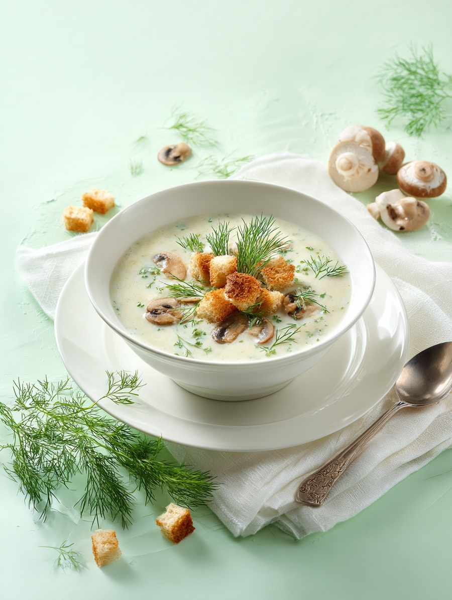 Состав: Грибы шампиньоны, картофель, лук репчатый, сельдерей, сливки коровьи 10%, соль, перец черный, масло подсолнечное, лавровый лист.