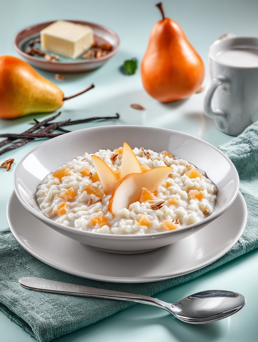 Состав: Крупа рисовая, молоко коровье 3,2% жироности, груша, стевия, эритрит, сукралоза, ванилин.